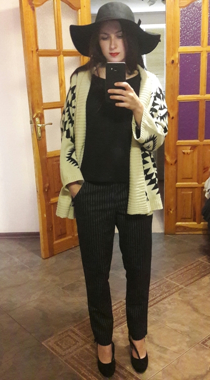А мне кажется не хватает элегантности в образе.К этой шляпе хорошо подойдут широкие брюки, длинный кардиган и кружевной топ. Или джинсы клеш, майка и кардиган крупной вязки. И обувь без каблука.
