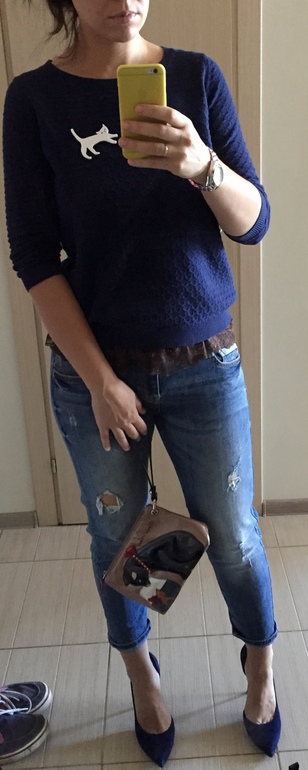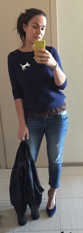 Мне опять все нравиться ) . Молодец ! Будет жарко , снимешь свитерок , в топе на танцполе самое то ! Единственное смущает каблук , но я бы все равно пошла в лодочках , завсегдатаи могут придерживаться определённого стиля , а изредка приходящим , можно и выделится ) . Кстати , забыла спросить, джинсы откуда , классные .