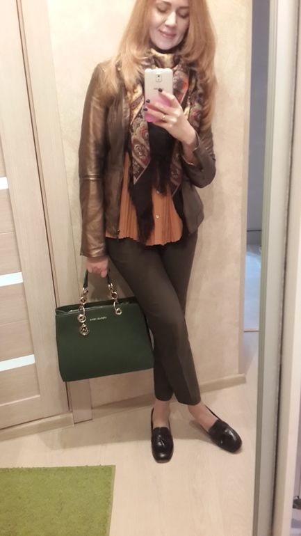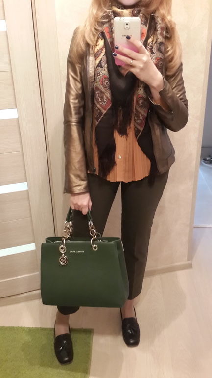 вторая фотка- класс. на первой я бы сумку заменила на рыже- коричневые тона, а лучше П платок заменить на шарф с небрльшими вкраплениями болотного. А еще, я воспринимаю павлопосадкские платки с шубой или пальто. С кожанками не очень...