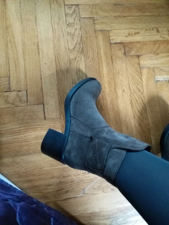 ОбувьДевочки, в прошлый раз вы мне очень помогли и отговорили от бртинок цвета морской волны, спасибо большое, где были мои глаза?! Теперь я сомневаюсь по поводу сапожек, купила, сначала нравились, думаю оставить или нет. Замша, цвет скорее серый с бежевым. Понравилось, что удобно и с колготками и джинсы можно заправить.
