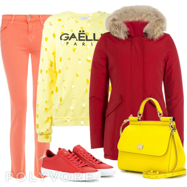 Беглым взгядом скажу сразу, что такая желтая сумка к красной парке, не подойдет, по дизайну совсем они из разных опер.