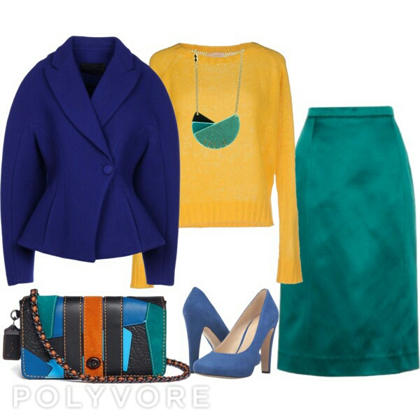 еще момент четвертый сет вызывает сомнения, у меня есть подобный опять таки жакет от теда бейкера:) добавить желтый свитер и бирюзовую юбку, и сумку и обувь в синей гамме. честно слабо представляю но тут цвета приглушенные, но хочется оттенков теплее они холодноваты. А вот если все яркое то можно смело в цирк с черныой базой идеальное сочетание а это жуткое яркое сочетание:) первые экперименты мои:) на тот момент хотелось ярких красок