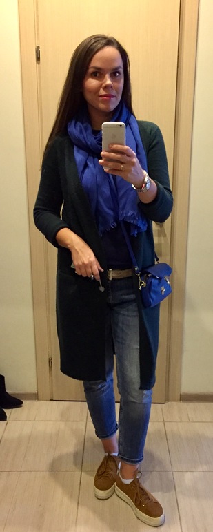 Так красиво! Я бы шарф поменяла, на мультиколор, и тогда любые брюки сюда будут в тему.