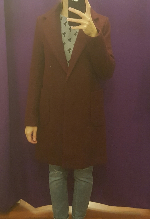 Мне очень нравится пальто, фасон и цвет. Сюда бы платок и юбку или платье. С джинсами тоже нормально.