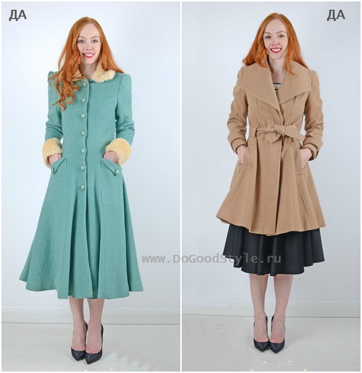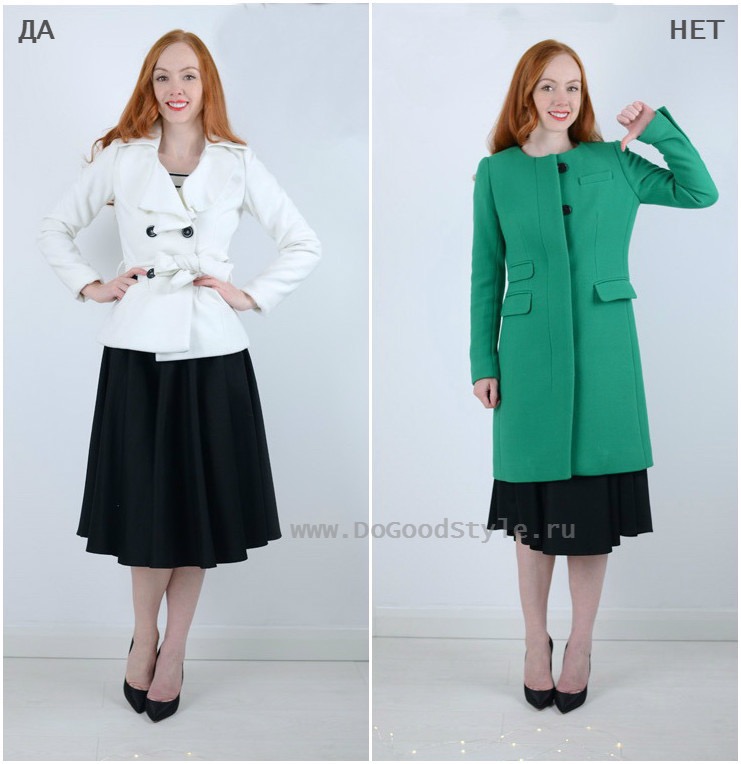 5.При выборе верхней одежды следуйте тому же принципу - предпочитайте приталенный силуэт. Укороченные куртки-косухи, приталенные пальто и полупальто будут смотреться с юбкой миди гармонично. Прямые пальто и куртки - наоборот, ломают силуэт и упрощают образ в целом. А в коротких пуховиках и объемных пальто в паре с юбкой миди вы будете выглядеть на пару размеров "шире".