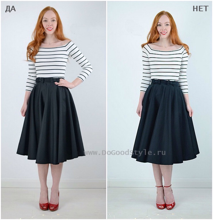 4.Расклешенная юбка миди делает акцент на талии, сохраняйте этот акцент, выбирая верх. Предпочтительные силуэты верха - прилегающие, приталенные, тонкие трикотажные топы или блузки, которые можно носить заправленными в юбку, укороченные жакеты и кардиганы с акцентом на талии. Объемные свободные блузы, свитера, жакеты лучше сочетать с прямой юбкой или юбкой-карандаш, а не с юбкой миди.