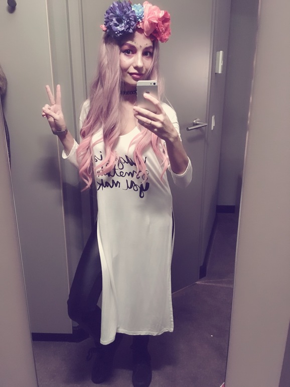 Очень долго искала подходящую одежду. Костюмы я терпеть не могу, но что то подходящее все же было необходимо. Это был капец, все не то, я обходила все магазины по десять раз и ничего.На ламоде откопала такую тунику с надписью Magic is something you make, кожаные леггинсы и высокие кеды. Сама соорудила ободок из покупных цветов (каждый покупался и искался отдельно), и парик с али, который пришёл прям впритык к дате отъезда.