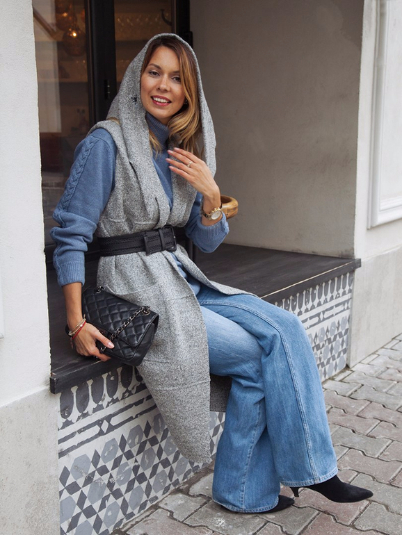 Очень все понравилось, особенно образ с розовым желетом. Подскажите пожалуйста откуда голубой свитер?