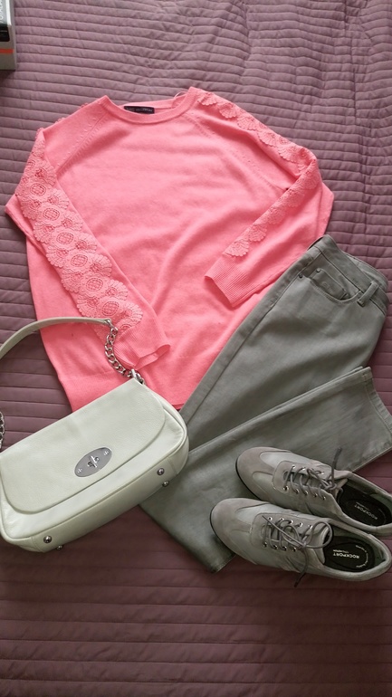 Серые джинсы, короткий плащ, серая сумка не совсем подходит по тону. Сюда прям просится замшевая сумка серого цвета, но пока не нашла. И наверное надо заменить платок на более серый, этот больше в серо- бежевый уходит.