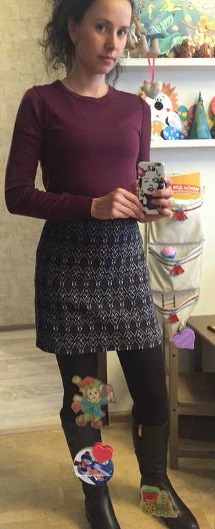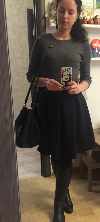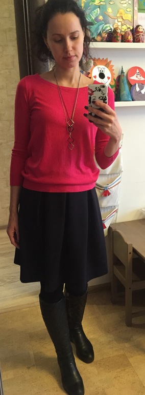 Т.к. у меня нет пока зимней обуви под брюки, ношу в основном платья и юбку (Остин, темно-синяя), меняя разный верх:)