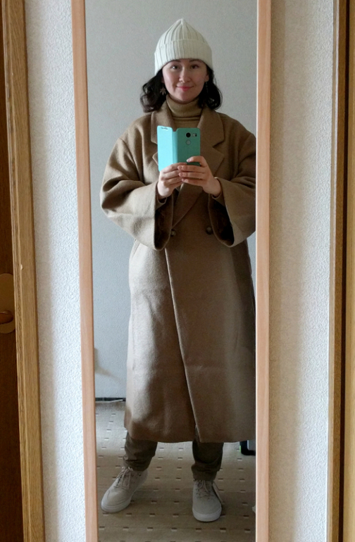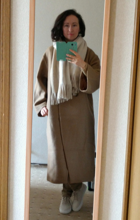 В итоге нашла на сайте H&M. В одноименном магазине подобных моделей не было, пришлось заказывать. Заказывала на размер меньше, но оно все равно необъятное...Но 100% шерсть, легкое, приятный цвет, теплое и длинное, как я хотела. Так что носить буду, только с чем комбинировать? Есть светлая шапка. С шарфом, вроде не плохо. Кеды с мехом тоже там заказала.