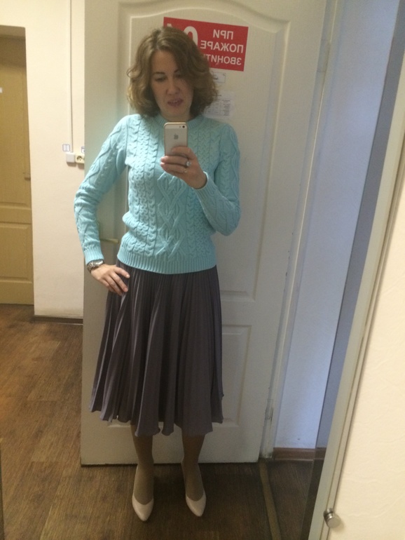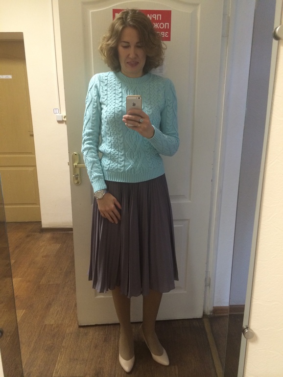 ты как всегда милая и романтичная!!! но если хочется немного критики, то попробуй свитер подвернуть внизу (так низ будет удлиняться) или заправить (так будет модно), ну а в идеале мне видится с плиссе свитер без узоров...