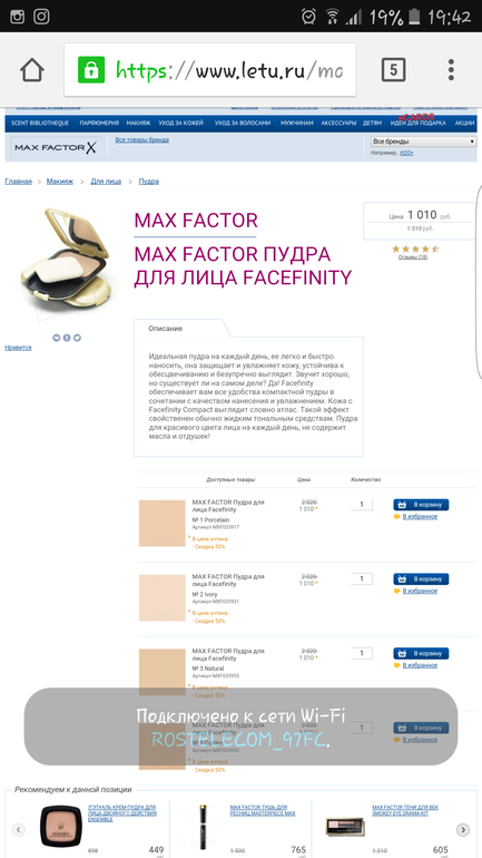 Со вчерашнего дня в данном магазине началась акция -50%. У меня заканчивалась уже пудра,решила сходить и купить. К слову пудра у меня масс маркет, обычный такой Максфактор. Пудрой этой пользуюсь уже лет 10,по всем параметрам мне подходит и люблю ее очень! То есть,цену на неё я уж точно знаю) Прихожу,выбираю,глянула на ценник и чуть не упала! Со скидкой 50% она стоит 1010р!!!! Это что??????? Я вышла с Летуаль и в Рив Гош со своей картой 25% купила её же за 459 рублей! Без скидки была около 750... По логике Летуаль данная пудра, не Бог весть какого качества, стоит 2020 рубля??? Это же Максфактор!!! Всего лишь. Что тогда с ценами на Кларанс, мою любимую Shiseido??? Была бы без ребёнка,прошлась бы по ценам досконально!