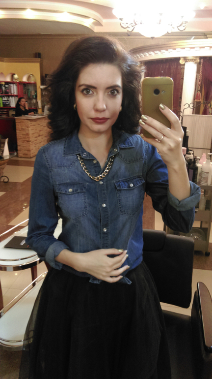 Прическа меня огорчила, честно говоря, т.к. я хотела крупные волны, но мастер начала меня убеждать, что на моих волосах все распадется через полчаса и в итоге сделала на утюжок, хотя я сама на него кручусь постоянно ((( попыталась сделать начес, в парикмахерской он еще был, а потом опал )))