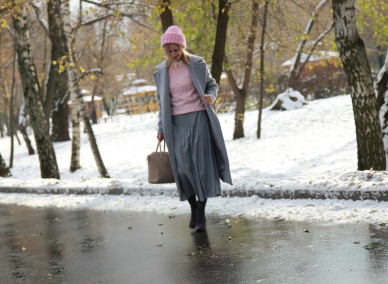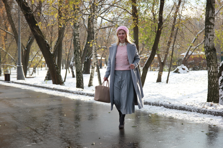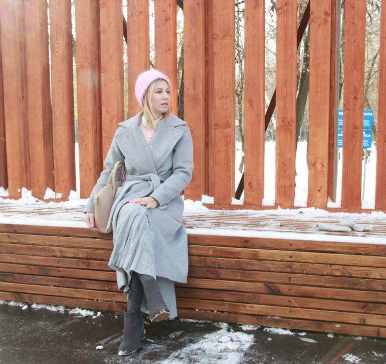 Когда пальто запахнуто, сразу видна пустота в области шеи и груди. Брошь и шарф все же не помешали бы. Аксессуары делают образы законченными.
