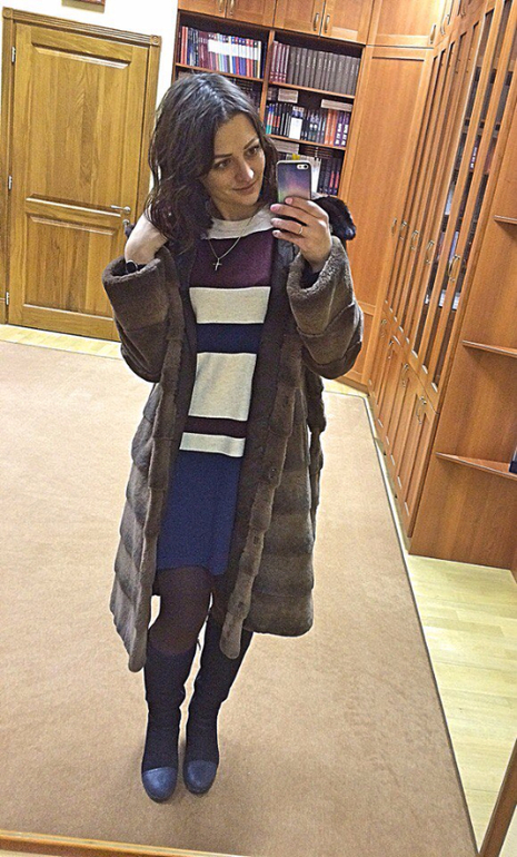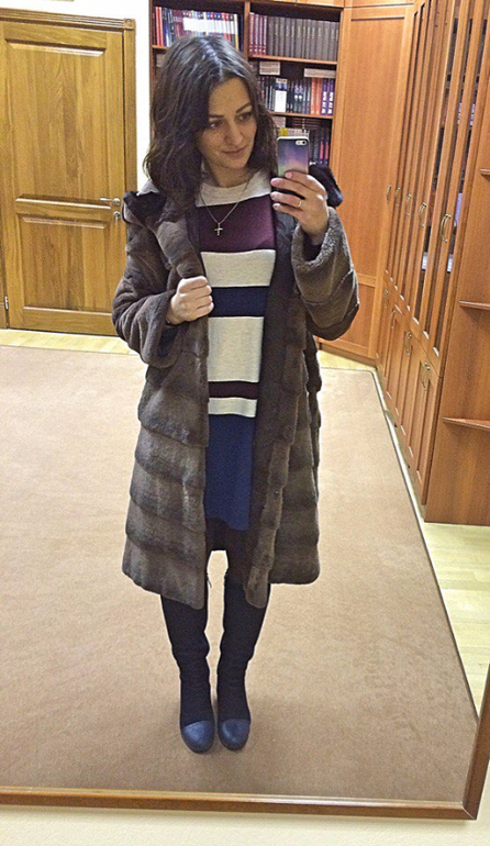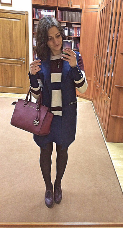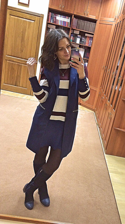 Доброе утро, красавицы! Я сегодня в своем платьишке-свитерочке, которое обожаю всей душой и очень рада, что его купила! В прошлый раз вы мне под него советовали плотные колготки цветные, вот надела коричневые, они такого же цвета, как полоски на платье. Ну и жилет.