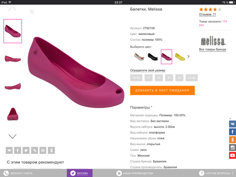 У меня такие другого цвета. На мой 36,5-37 в зависимости от обуви у Мелиссы беру 38. Если будете заказывать на вб, возьмите разные померить, чтобы не ошибиться.