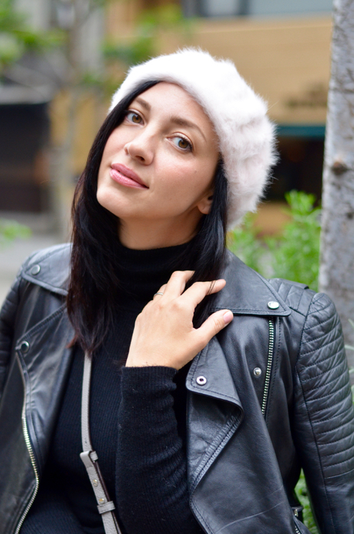 Что во мне вызвало дисгармонию - это берет, который кажется белым, но "грязнее", чем кроссовки и совсем белым по сравнению с носками (с удивлением в комментарии прочитала, что берет розовый). Не знаю почему, но мне странно видеть голые ноги + пушистый берет. Но может на меня так - 13 за окном действуют? Если бы берет был розовее я бы искала мохнатые носки )))