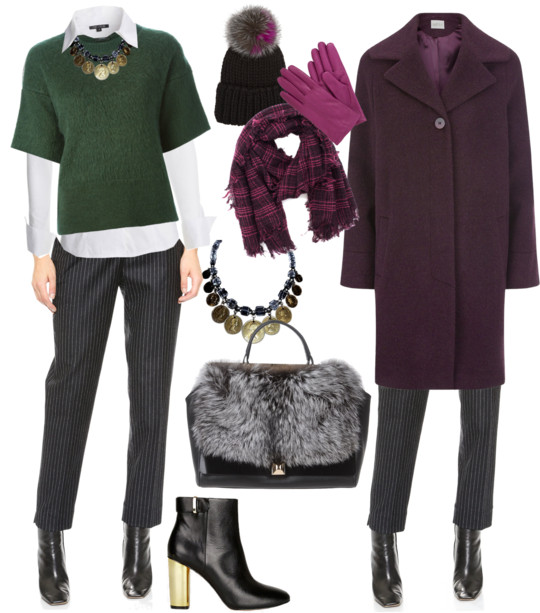 Брюки я бы другие. Светло-серые однотонные с небольшим блеском видятся сюда. Свитер с майкой - классно!