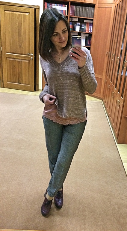 Юля, мне нравится и с этими брюками) На мой взгляд диссонанс возникает в районе щиколотки)) Если бы обувь заканчивалась под брюками и не было полоски "голой" ноги, смотрелось бы совершенно иначе)