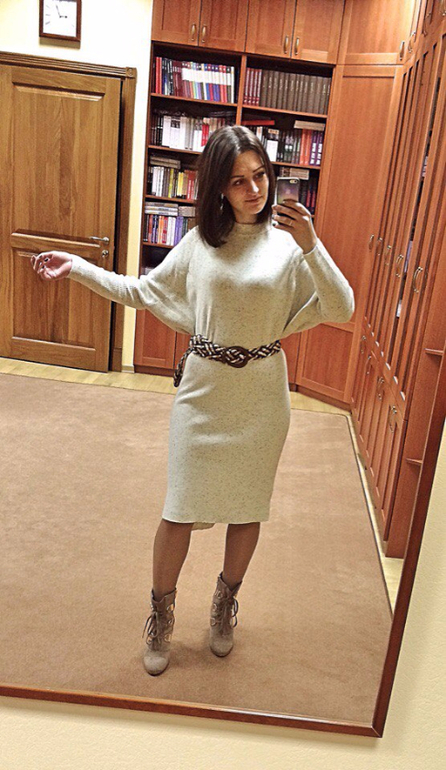 Платье нравится, боты тоже, а вот пояс совсем нет.((...может или тоньше или лично я одела бы с длинным тонким украшением...тем более раз платье мягкое уютное.