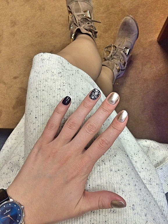 Ну а маникюр - фиолетовый (осталось по 2 пальца на каждой руке с шеллаком, остальные я сняла...) с золотым. Кстати, лак прикольный, обычный Макс Фактор, а выглядит, как втирка зеркальная )