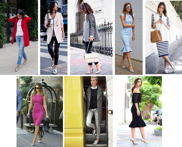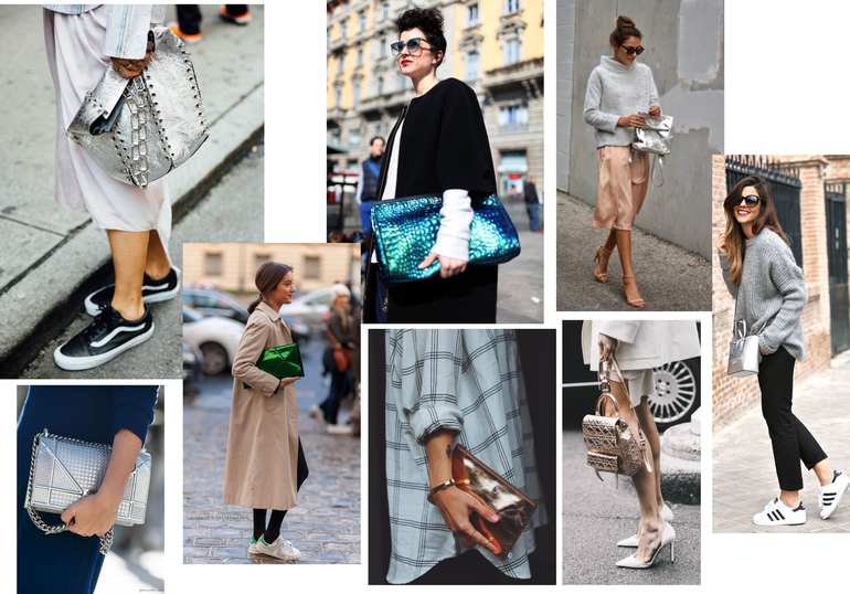 Если вы не готовы к покупке такого плана одежды, то гардероб можно смело разбавить обувью или сумкой. Убеждена по собственному опыту и по опыту моих клиентов, что обувь или сумку с металлическим эффектом можно смело отнести к базовым вещам гардероба!