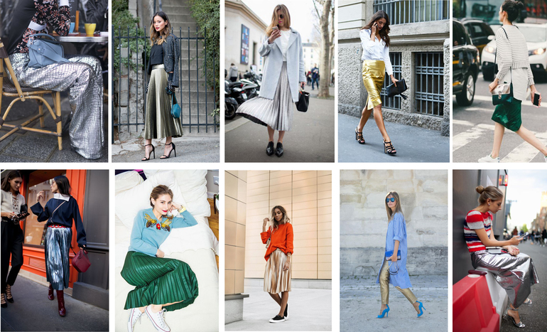 Ниже луки с разными по характеру вещами и разной цветовой гаммы. Темные, светлые, нежные, глубокие оттенки отлично комбинируются с металлическим цветом.