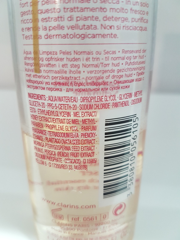 Clarins очищающая вода для нормальной и сухой кожи с экстрактом персика.