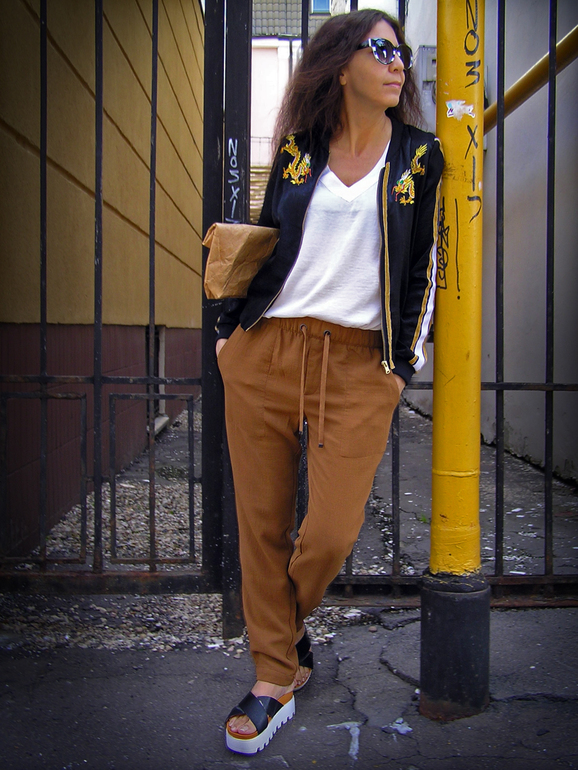 Джоггеры. Пояс на резинке, как у спортивных, но сшиты не из трикотажа. Смотрятся прилично, подходят подо все, ноги можно на уши задирать).