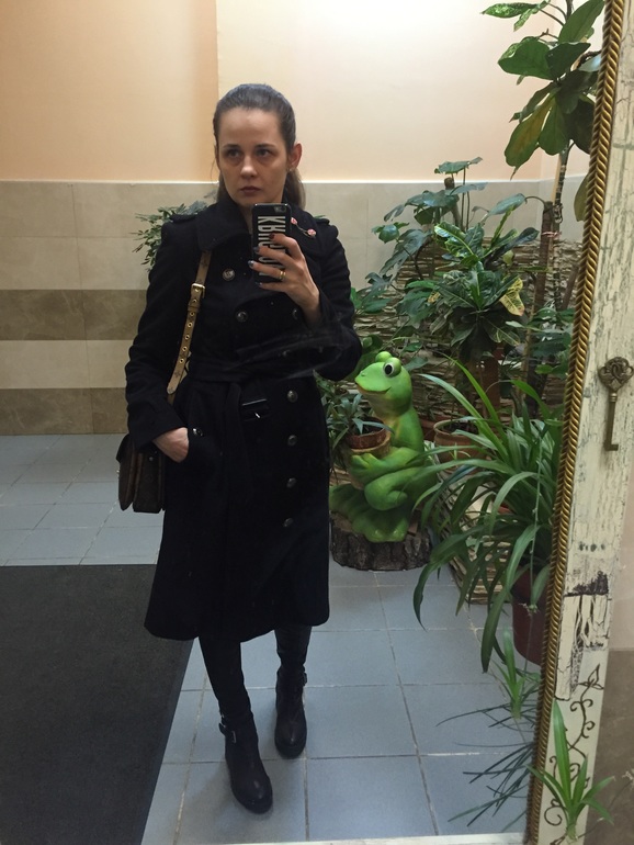 На ногах ботфорты, пальто шинель и кросс-боди. За брошь спасибо Ретуксе)