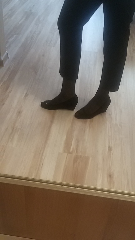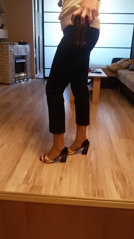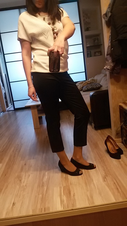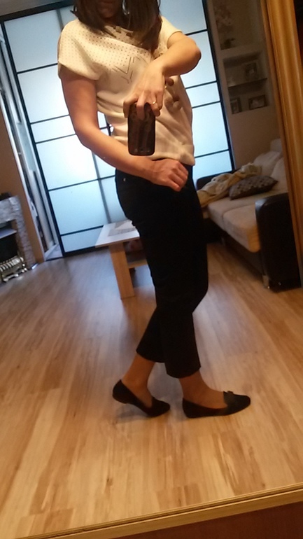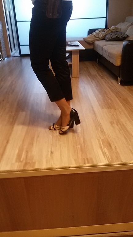 Эта полоска телесных колгот между ботильонами и Капри делит вашу ногу на 3 части, это очевидно. Одевайте только с телесными колготками или гольфами туфли или балетки-мокасины, либо на голую ногу. Ни в коем случае с черными колготками!