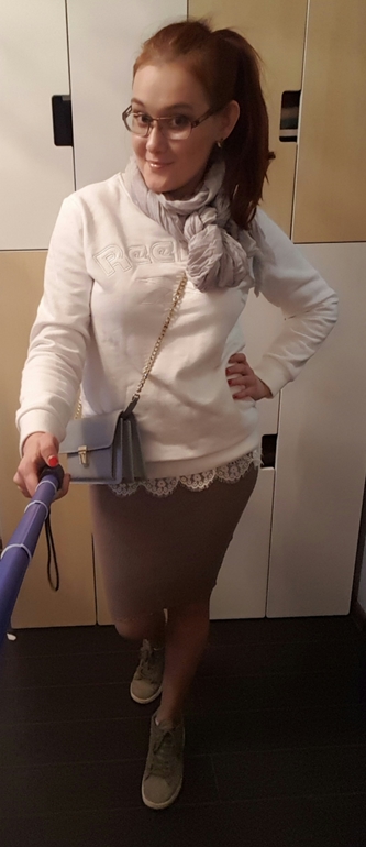 Меня смущает кружево. Мне кажется, под спортивную кофту оно не очень. Точнее не так, если б на кофте не было ничего написано - было б все гармоничнее.