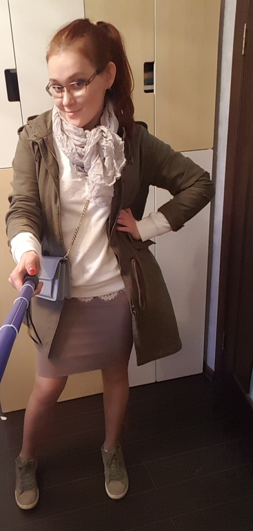 Ваш образ - все лучшее надену сразу, очень небрежный, не продуманный. Что не понравилось: торчащие из куртки рукава от толстовки, платок навернули кое-как (платок не настолько объемный, чтобы выкрутить его в такой узел), юбка не спасает ситуацию, а еще больше подчеркивает разномастность вещей.