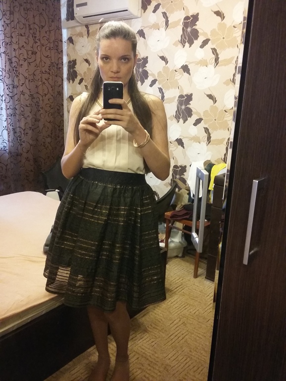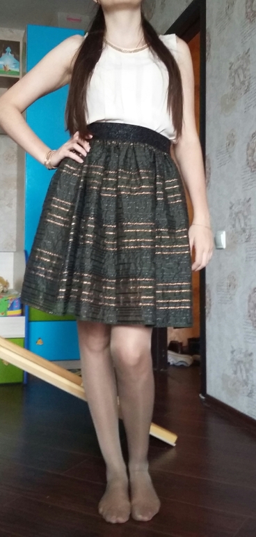 Я тоже мерила империальскую юбку. Не купила. Синтетика, нитку торчат, еще и минимум на размер больше. Ваша смотрится вполне, чуть длины не хватает, на мой взгляд