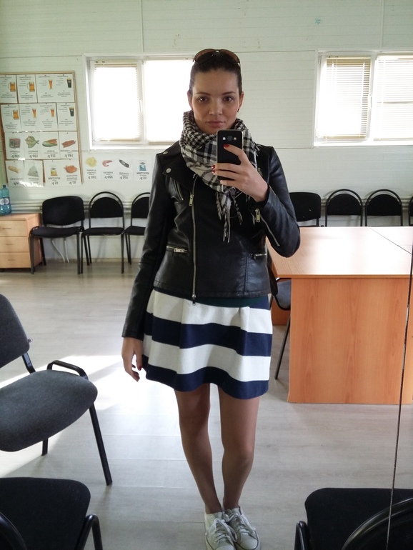 Надо ещё подумать с чем ее носить. В таком сочетании не нравится, извините... Ну и майка с шарфом выглядят спорно вместе. Вы такая стройняшка, что без проблем украсите себя чем-то другим ;)