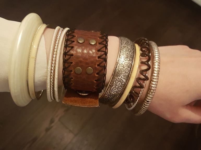 Мне первый нравится, только оставить на шее одно крупное ожерелье и кучу браслетов
