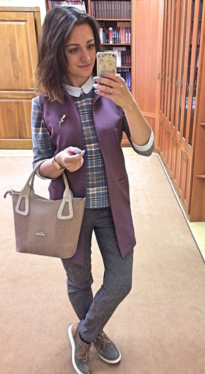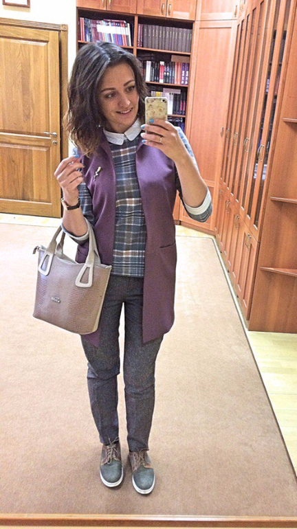 Я все играюсь со своим жилетом ) Он на самом деле универсальный! Вот какую брошь прилепишь - с таким низом и надевай! ) Яркая брошь - яркие штаны, спокойная - спокойные )