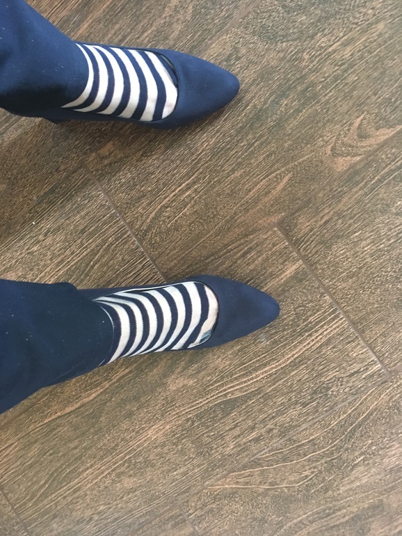 Не хочу обидеть, но носки с туфлями напомнили ноги зебры..Без полосок все же будет лучше) Сложный для применения в обычной жизни тренд носочки, легко перейти грань когда это уже не выглядит модным и стильным..