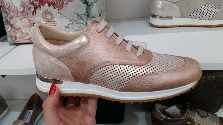 А у меня такая бежевая. Очень удачная модель. Под нее буду носить бежевые лодочки с открытой пяткой на каблуке, бежевые босоножки на каблуке и белые кожаные (но очень легкие) кеды. Кросовки к ней тяжеловаты, мне кажется.
