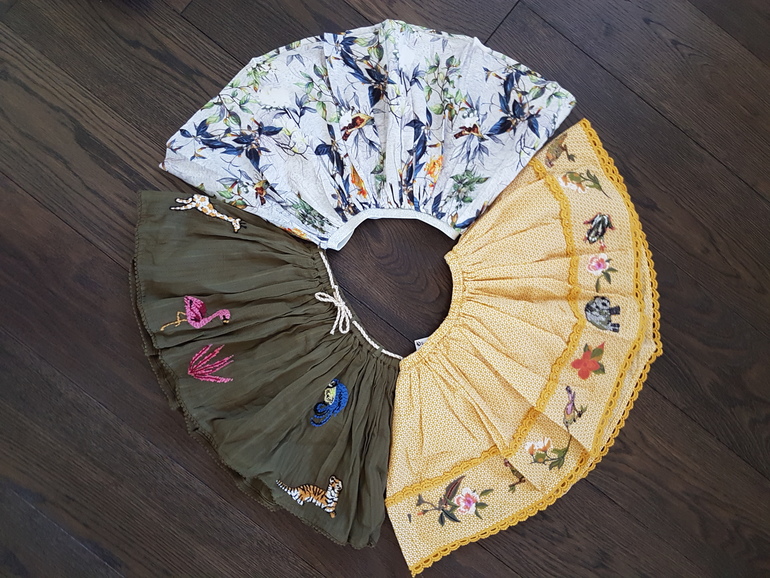Я накидала вчера. Юбку вашу болотную и платье разноцветное,но в конце мне выдало 104 разм раскуплен😧И я ничегошеньки не взяла. Скажи,юбка регулируется в ширину? Пуговички есть? Нам все велико.