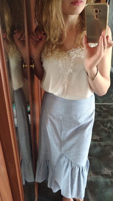 эту же юбку носила с этой майкой с рюшами, фотки нет. Есть с пляжными джинсовыми шортами