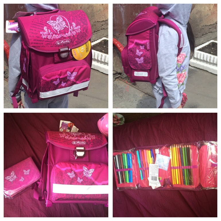 Мы купили Немецкий herlitz, качество отменное, до 5-ого класса говорят выдержит, гарантию год дают. Проверено на первоклассниках подружек в этом году- говорят как новенькие. Самое главное, что стирается хорошо и сохнет быстро и ничего ему не делается. Ничего лишнего, материалы на ощупь совсем другие, вес всего 900гр, отртопедическая спинка. Мы ещё пенал докупили к портфелю, канцелярия внутри- тоже herlitz- убила несколько зайцев сразу. Продавец тоже говорил, что ранец этот ни на один год и лучше выбирать расцветку оптимальную. Но Лили все понравилось и мне. Есть у них комплекты с разными пеналами и сумками маленькими спортивными- для спортивной формы.