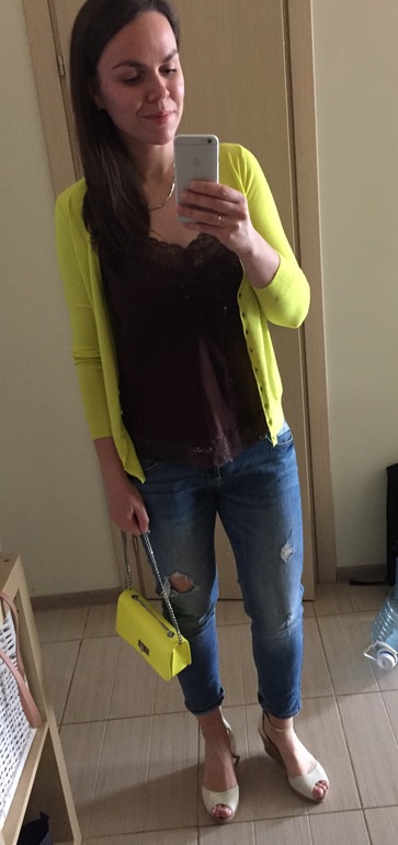 думаю, брать этот топ или нет? к нему еще надо бюстгальтер шоколадный и сумочку желтую тащить😂