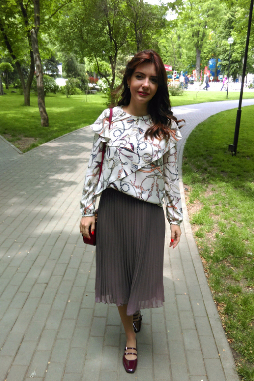 Так тоже очень хорошо! Я пока плохо умею собирать образы, поэтому смотрю в магазине, с чем скомбинировано и беру. Мне нужна была юбка карандаш, так бы на эту блузку даже внимания не обратила, а получилось хорошо в итоге