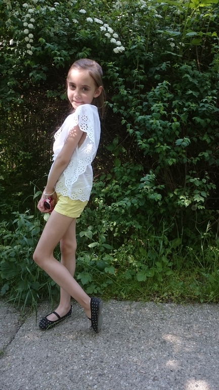 На прогулкеИ можно уже доставать из сундуков летние вещи. Вот так ходили с дочкой в танцевальную студию