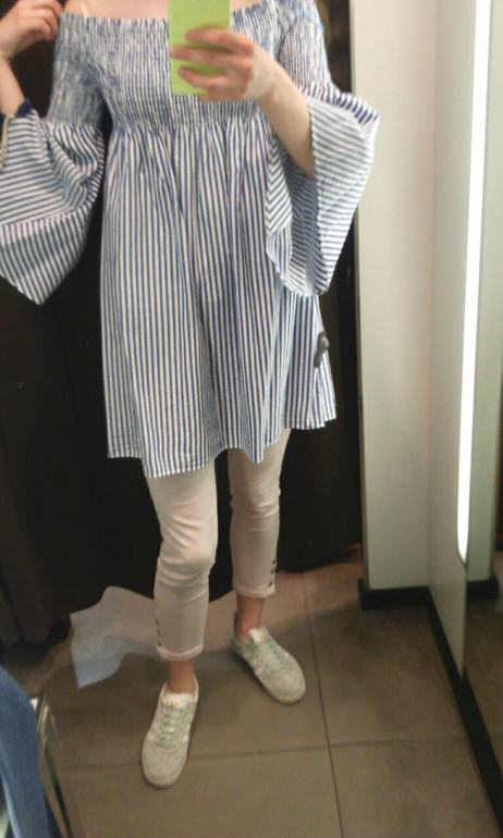 Полосатое мне вообще не нравится. Джинсы, вроде сидят хорошо. К джинсовому платью вижу с эспадрильи на танкетке (которых нет)