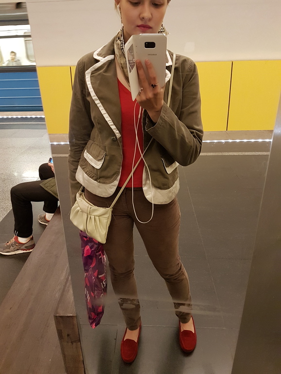 Самая стильная!Продолжаю разнашивать мои красные замшевые макасики. В прошлый раз выгуливала с серыми брюками, нынче с коричневыми штанами.