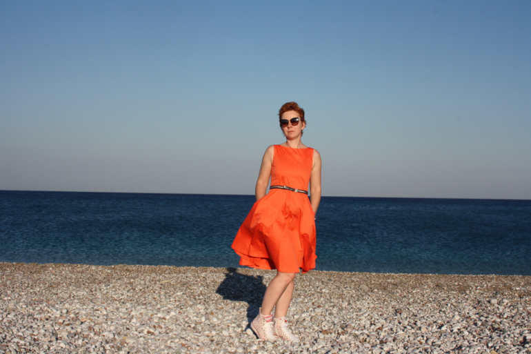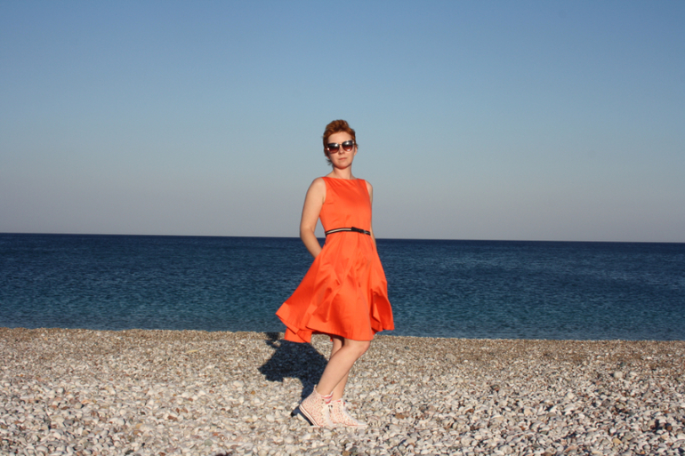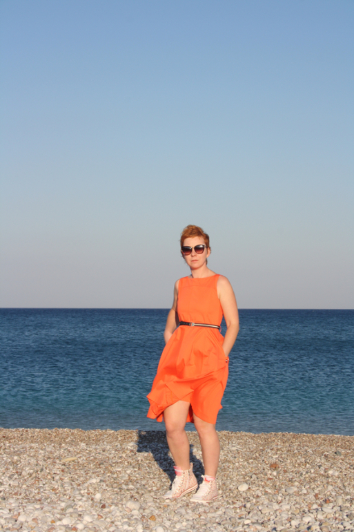 Платье вам идет. И на ноги не грешите. Просто эта обувь совсем не для этого платья. Оранжевый с черным ремнем выглядит довольно драматично, под шпильку разве что. Вам правильно советуют подобрать ремень и обувь "беззаботных, летних" цветов.