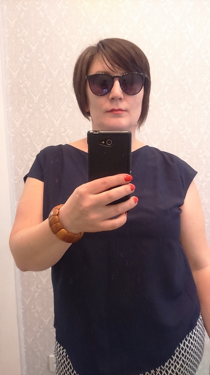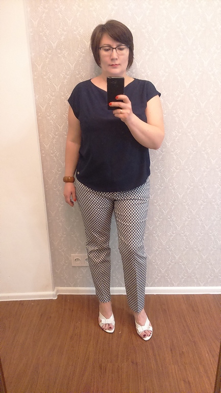 первая блузка смущает, брюки отличные обе пары, второй образ здорово. Очки не могу понять, нравятся или нет.